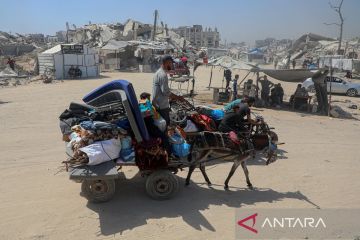 MIDEAST-GAZA CITY-DISPLACED PALESTINIANS. (250516) -- GAZA, May 16, 2025 (Xinhua) -- Displaced Palestinians are seen in Gaza Warga Palestina mengungsi dengan membawa barang-barang mereka saat melintas di Kota Gaza, Jumat (16/5/2025). Saksi mata dan sumber keamanan melaporkan serangan udara dan darat Israel terus berlanjut tanpa henti sejak dini hari yang menargetkan rumah-rumah penduduk serta tempat perlindungan di Jabalia dan Beit Lahia di Jalur Gaza utara, sementara beberapa korban masih tertimbun reruntuhan. ANTARA FOTO/Xinhua/Rizek Abdeljawad/tom.